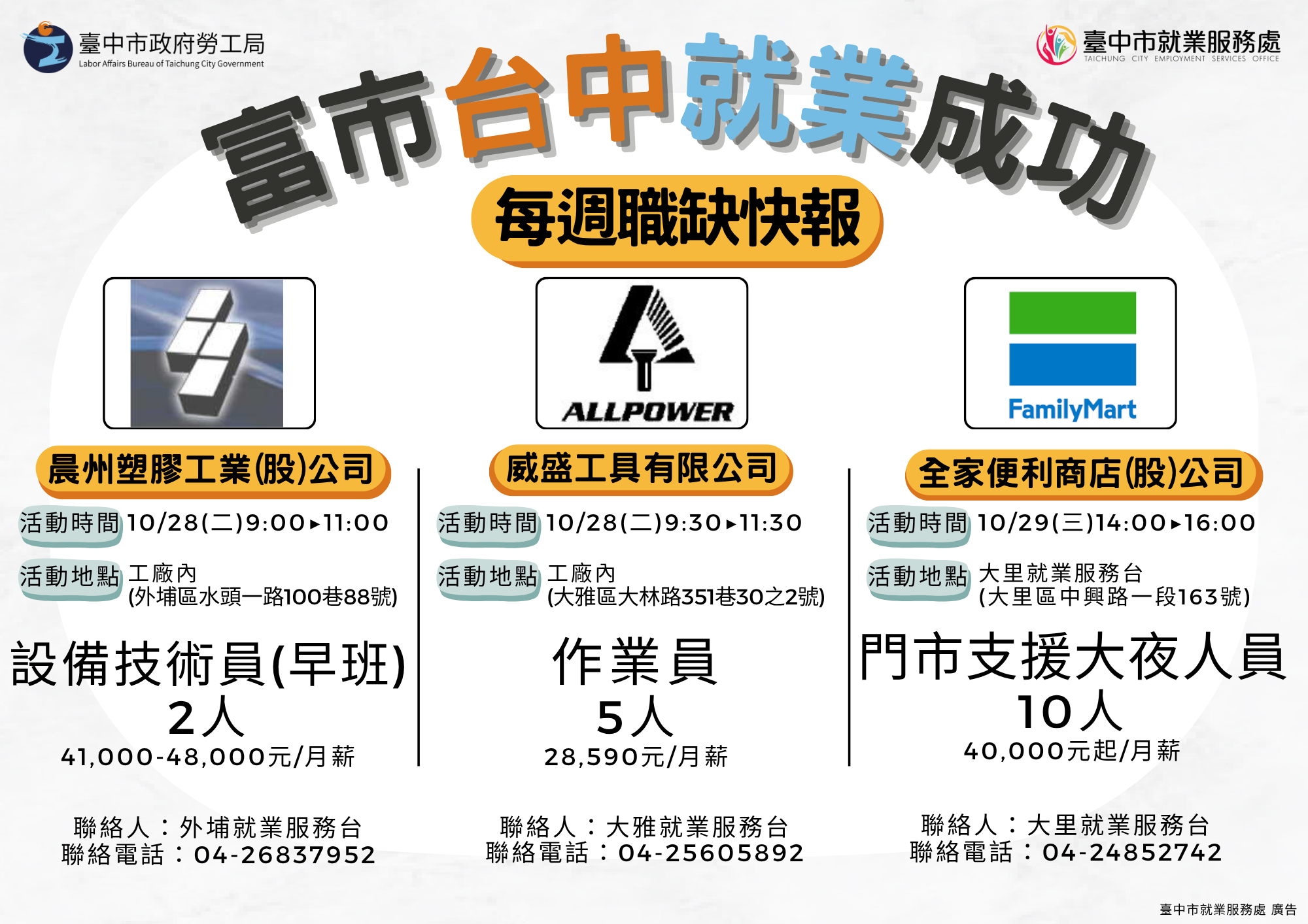臺中市政府職缺快報來囉!10/27-11/1邀請晨州塑膠、威盛工具、全家等廠商,辦理15場徵才,提供6,159個職缺,查詢更多職缺資訊(連結網址如下,另開新視窗),請洽04-22289111轉36100洽詢。