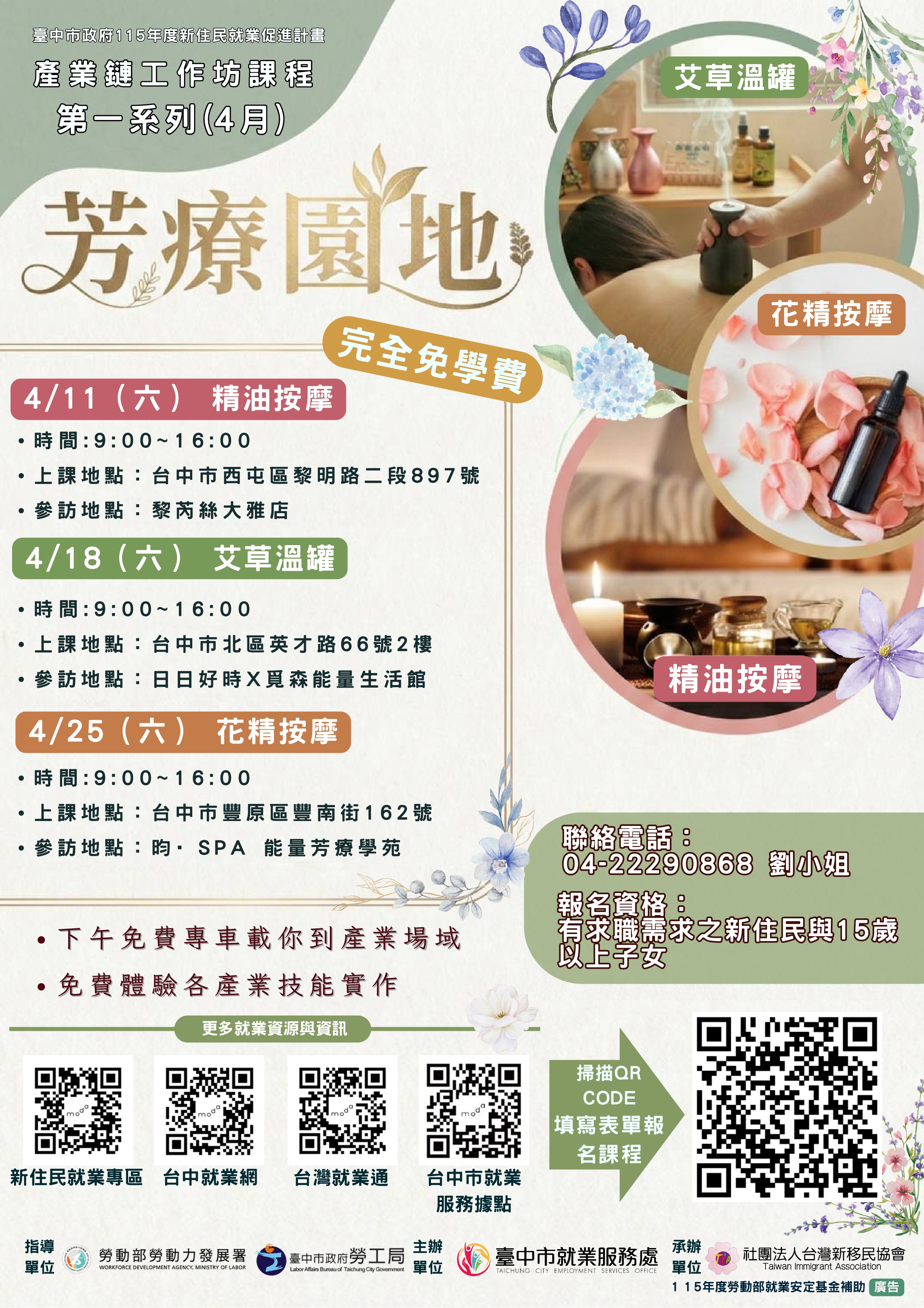 臺中市就業服務處委託社團法人台灣新移民協會辦理「芳療園地」產業鏈工作坊,課程活動資訊如下: