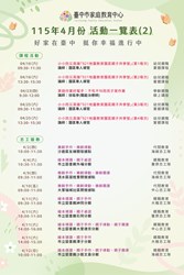 臺中市家庭教育中心115年4月份活動一覽表,歡迎踴躍報名。