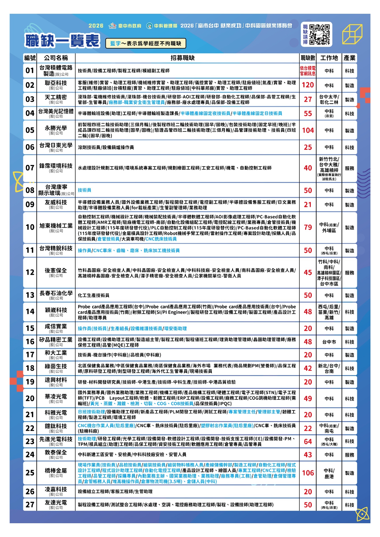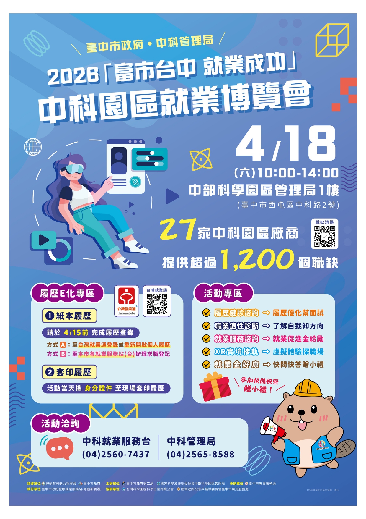「富市台中 就業成功」中科園區就業博覽會 開啟科技職涯就趁現在!2026中科就業博覽會將於4月18日(星期六)上午10時至下午2時在中科管理局盛大展開,邀請台積電、台灣美光及矽品精密等27家中科廠商,釋出超過1,200個職缺,臺中市政府歡迎您踴躍參加。活動詳情請至臺中市就業服務處官網查詢。
